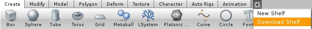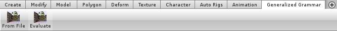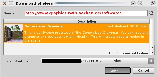 The installation of the script package is very easy. First of all, the Houdini modeling software from SideFX has to be downloaded and installed. There is a free apprentice version available for download on their website (http://www.sidefx.com). Once this is done, the program can be started and a new shelf can be downloaded by clicking on the little plus sign in the topmost toolbar and selecting the entry "Download shelf..." from the menu (cf. Figure 1). A new window will open with a default location for downloading content. Here, the location of the G² script package has to be entered (http://www.graphics.rwth-aachen.de/software/generalizedgrammar/download). After the URL was typed in, the entry "Generalized Grammar" has to be selected from the list and the download button on the bottom of the window has to be clicked (cf. Figure 2). A dialog should appear, which states that the installation was successful. Finally, the new shelf GeneralizedGrammar, which provides two buttons, should be available (cf. Figure 3). When the buttons are created the first time, they will have a H logo. This changes as soon as the button is pressed. The first button (i.e. From File) will load and execute a grammar from file. The second button (i.e. Evaluate) will execute the last loaded file again. This is easier, if the grammar file or any of the system files have changed.