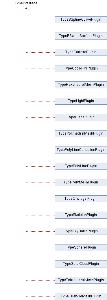 Implemented in TypeLightPlugin, TypeBSplineCurvePlugin, TypeBSplineSurfacePlugin, TypeSkeletonPlugin, TypeCameraPlugin, TypeSplatCloudPlugin, TypePolyMeshPlugin, TypeQtWidgetPlugin, TypeTriangleMeshPlugin, TypePlanePlugin, TypeSpherePlugin, TypeCoordsysPlugin, TypePolyLinePlugin, TypePolyLineCollectionPlugin, and TypeSkyDomePlugin.