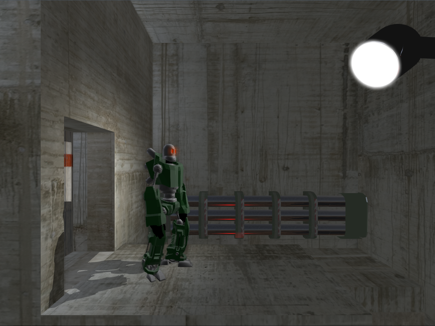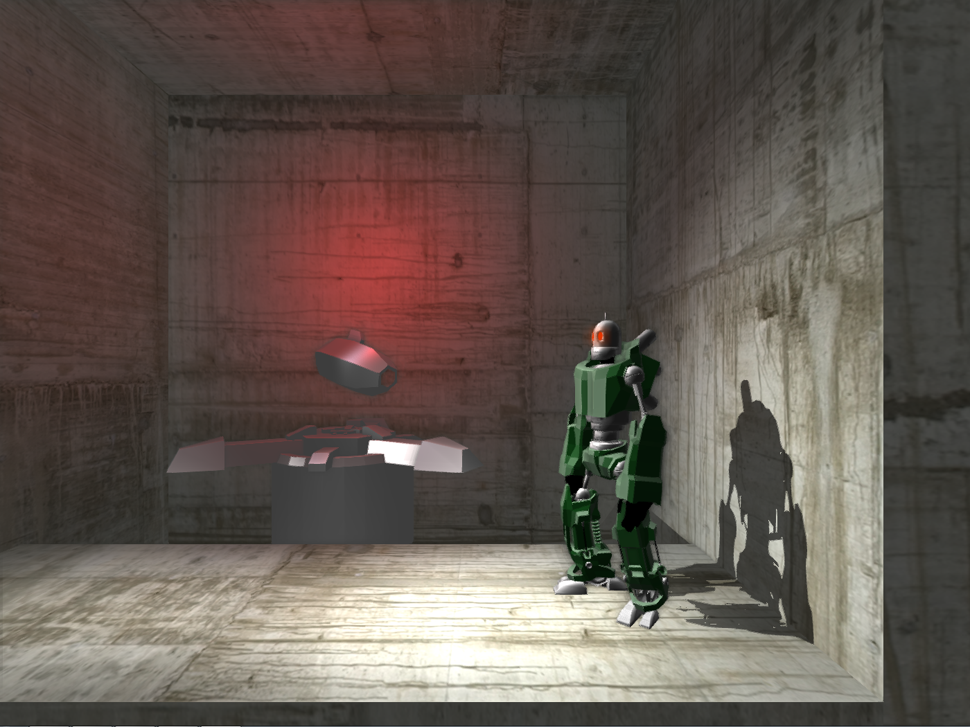 Each level is divided into distinct, quadratic rooms arranged on a grid. Any time during gameplay, the room containing the main character can be rotated (subject to some rules, of course) in order to rearrange its grid position and orientation, so that what was previously a ceiling or wall can suddenly become a floor with respect to adjacent rooms, and vice versa. We decided to use a deferred rendering pipeline due to stylistic decisions. For example, the game takes place in an abandoned space ship, i.e. a sci-fi setting, and consequently draws a lot of its atmosphere from lighting. Deferred lighting makes handling of many light sources comparatively easy. Conversely, well-known disadvantages of deferred rendering, like transparent objects, proved to be unproblematic due to the predictable 2.5D camera angle.