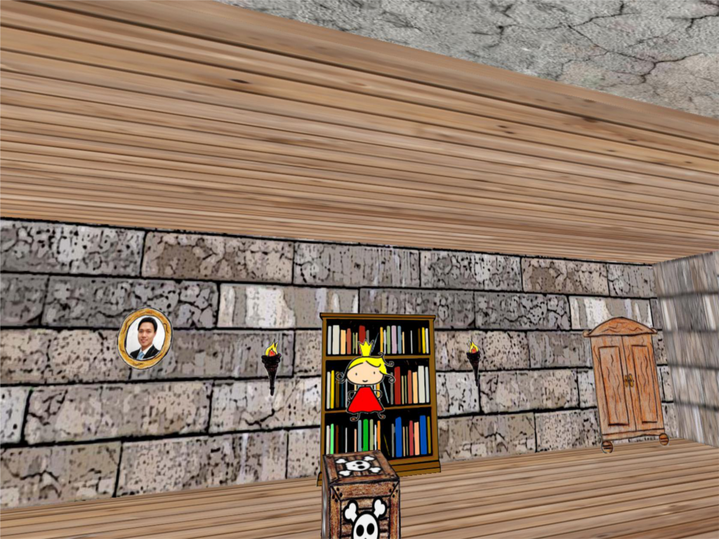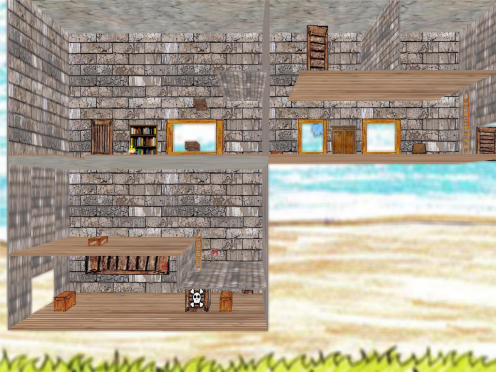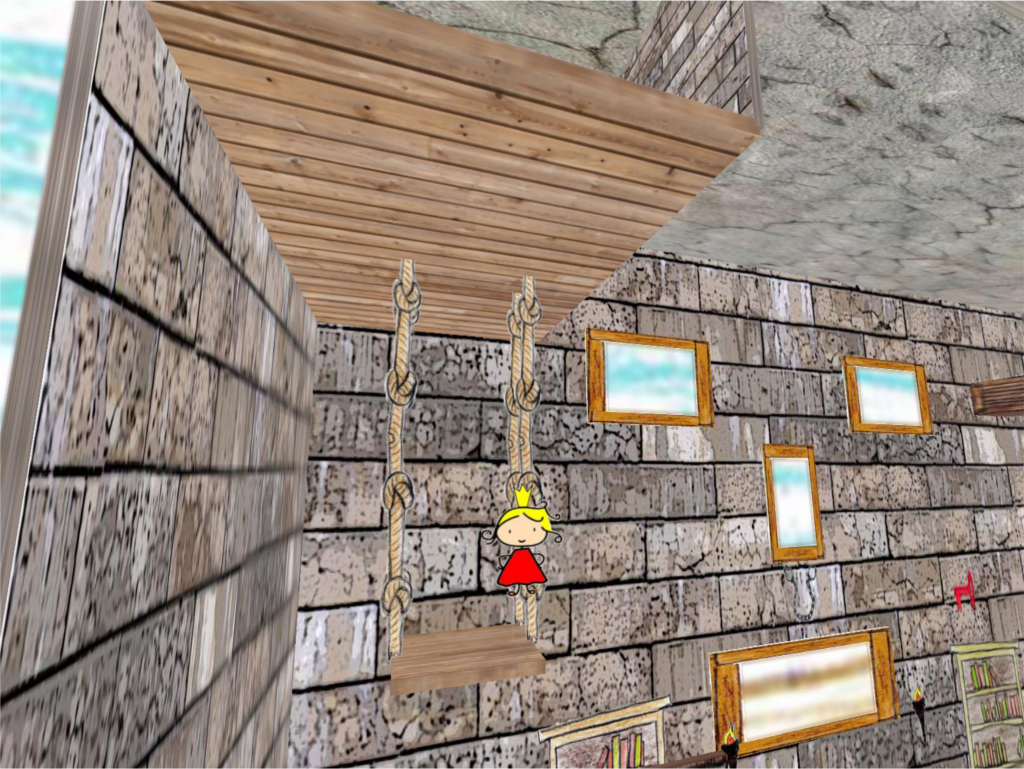 It is basically a Jump’n’Run game where you can (and have to) move around the rooms of the level to proceed from one room to another (see Figure 1). There are various assets in the game the player interacts with. Keys can be picked up to activate doors; there are moving platforms, traps, ladders and jumpboxes. After having completed a full level and finding the exit the whole level set flips around and another world starts on the backside. To make the world a little more vivid there are small animations like animated torches on the walls or clouds and balloons flying by the windows. The graphical style of the game consists of cartoon-like textures and hand-drawn assets. The target was to make it look like a stage design from a theatre play or like a dollhouse. The background assets are 2 dimensional and sometimes that can be seen when running around in the levels. This gives the feeling that the boxes and book shelves are not real but only there to make it more beautiful (like in a stage play as mentioned before).